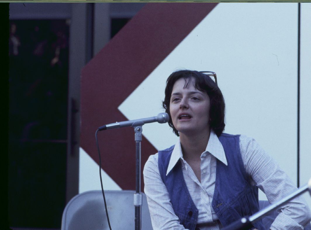 Woman seated and speaking to crowd. ; October 1976