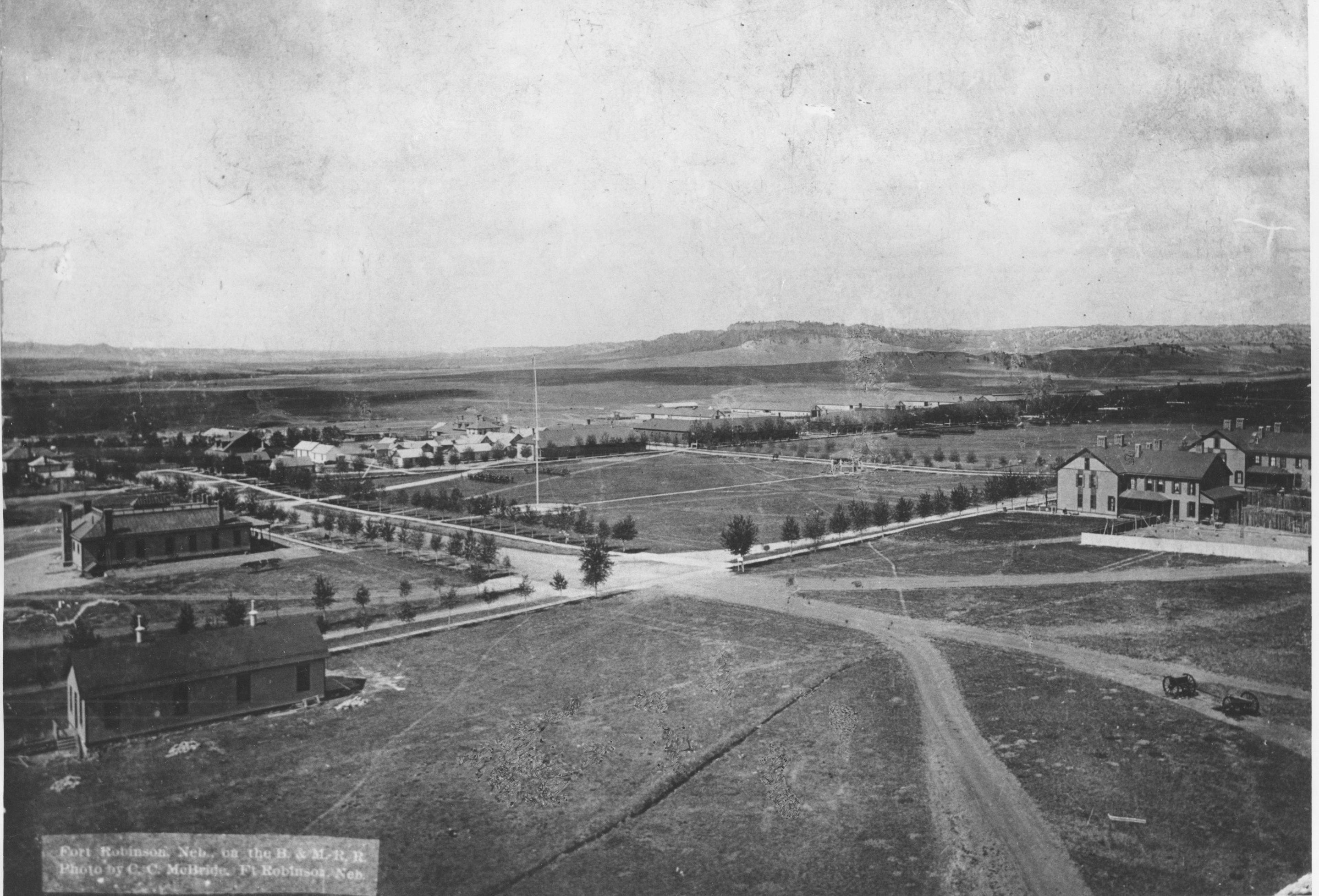Oblique view of Fort Robinson, Nebraska, taken in 1890. Fort Robinson was garrisoned by the 8th Infantry in 1890. This copy photoprint was made in May 1962 from an original print loaned by Vesper Garnett Trodick. ; 1890