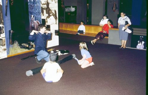 Ranger in costume speaking to a group of visitors. ; September 1990