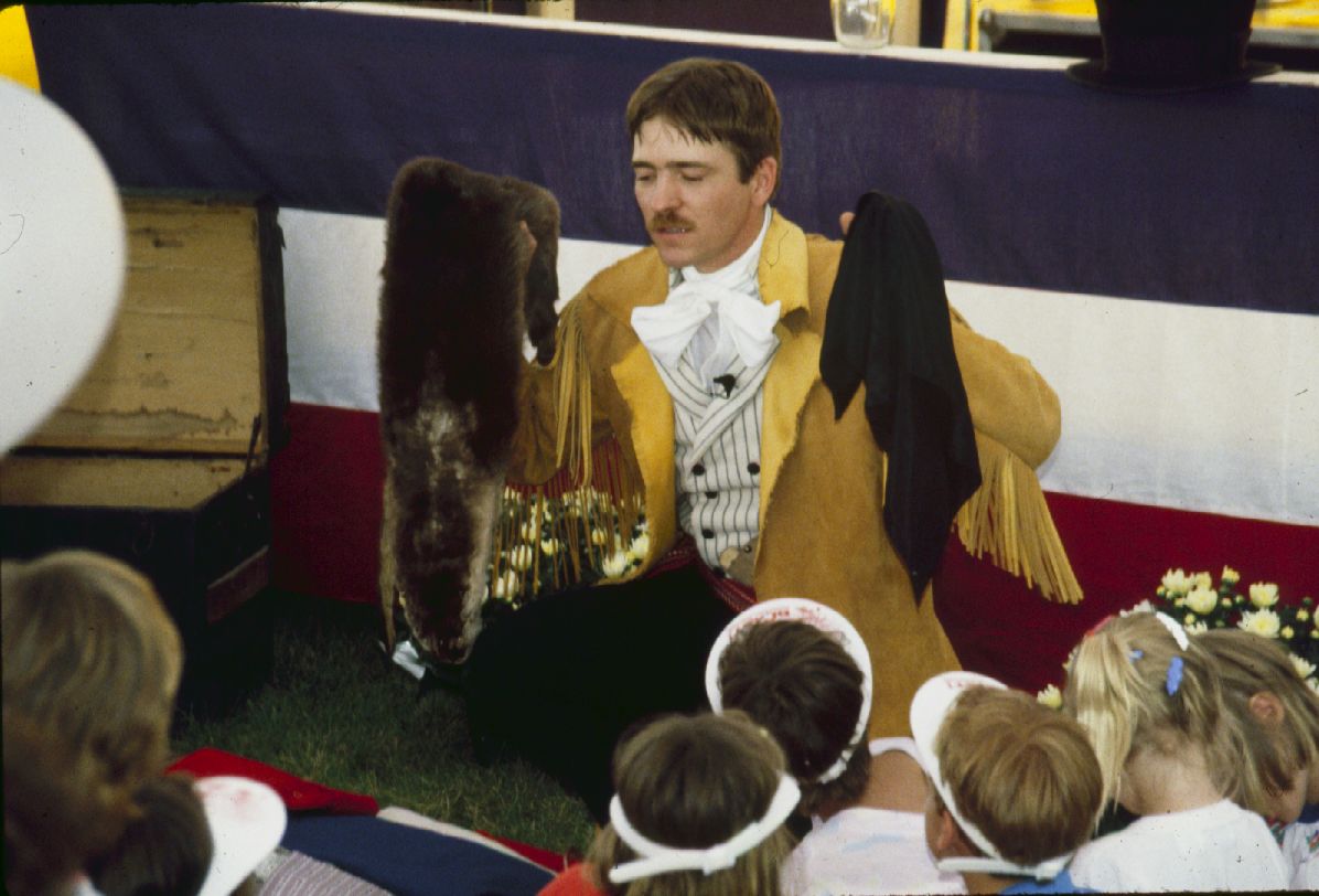 Man in a long coat displaying pelts. ; June 1988