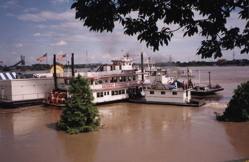 JNEM-Flood of '93-JNEM grounds-riverboat Gateway Cruise ship being moved. ; 1993