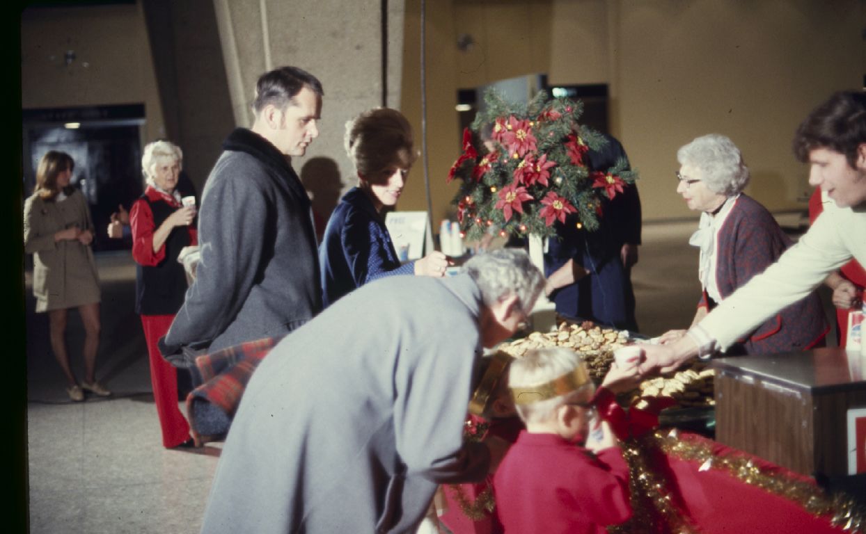 Visitors at the refreshment table. ; December 1, 1972