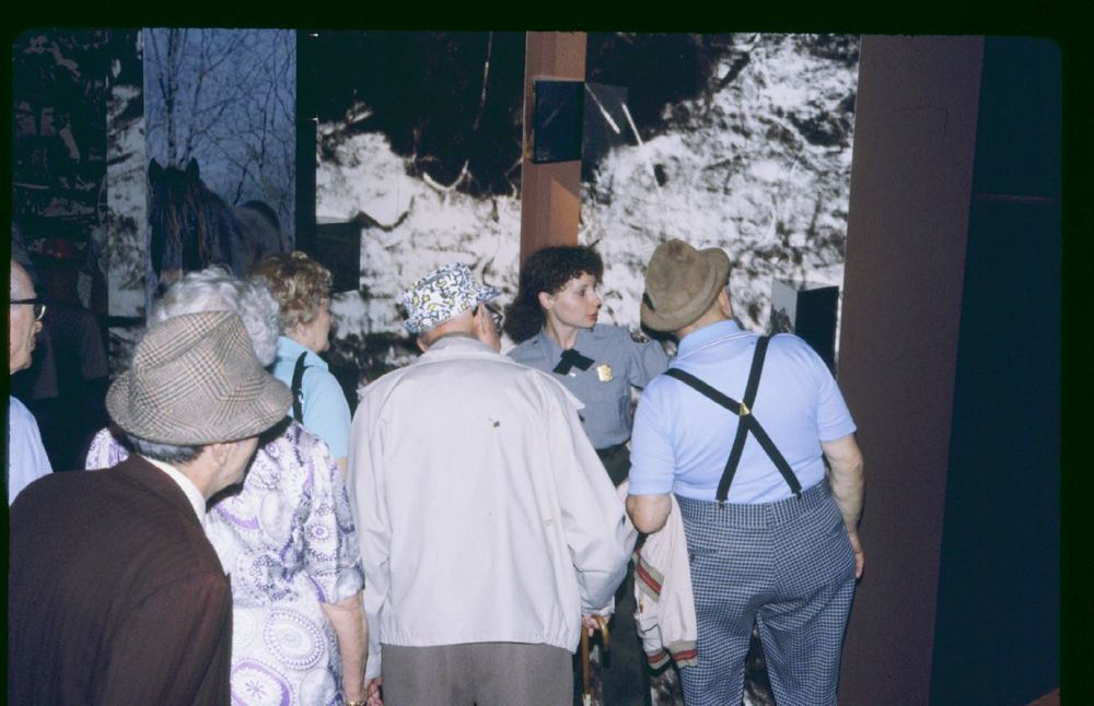 Ranger speaking to visitors at an exhibit ; May 1979