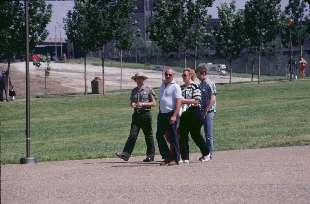 Ranger and visitors walking ; May 1978