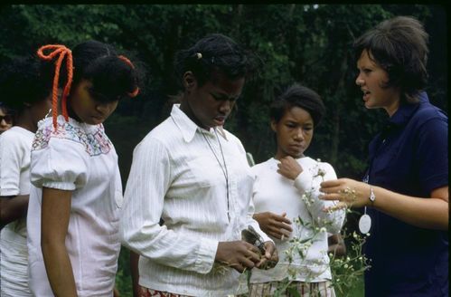 Looking at plants on the trail with Judy Williamson. ; August 1971
