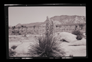Black and white image of Nolina in Hidden Valley campground with Ryan Mt. in background showing monzonite outcrop