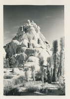 Black and white image of Joshua tree scene and towering piles of granite