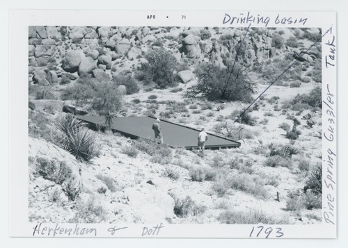 Black and white image of Pine Spring guzzler, N. Herkenham, and R. Dott