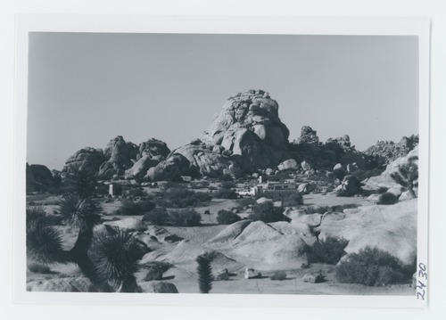 Black and white image of Hidden Valley Campground. Tall rock pile at entrance.