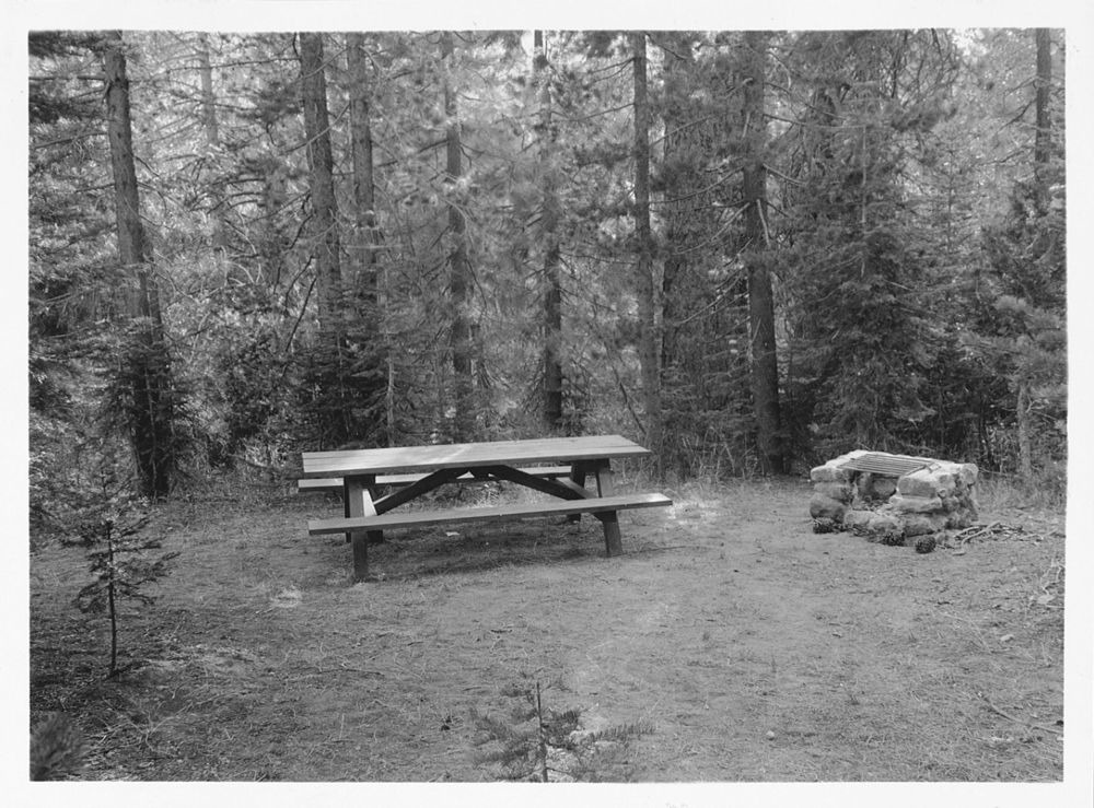 Administrative Collections: Album 5 (Emergency Conservation Works) -Picnic table and stone fireplace at Warner Valley campground