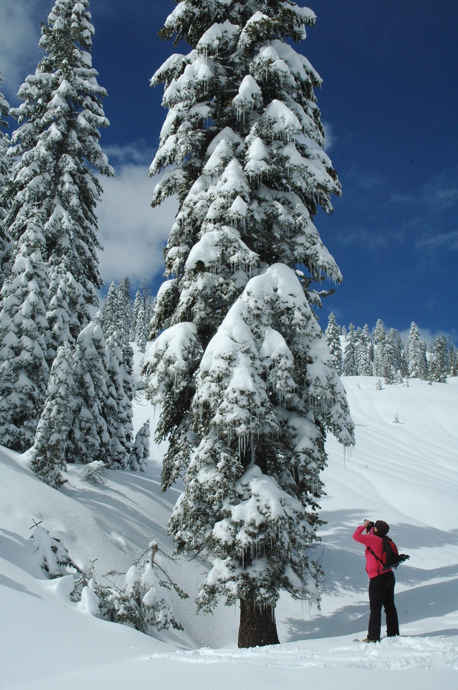 A snowshoer taking photos of a tree covered in snow and icicles next to the snow-covered park road near the Kohm Yah-mah-nee Visitor Center.