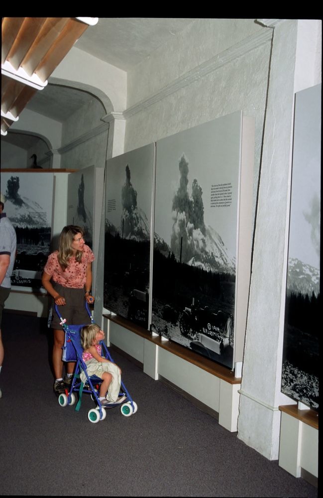 A woman and a young girl in a stroller looking at photos of Lassen Peak's eruption inside the Loomis Museum.