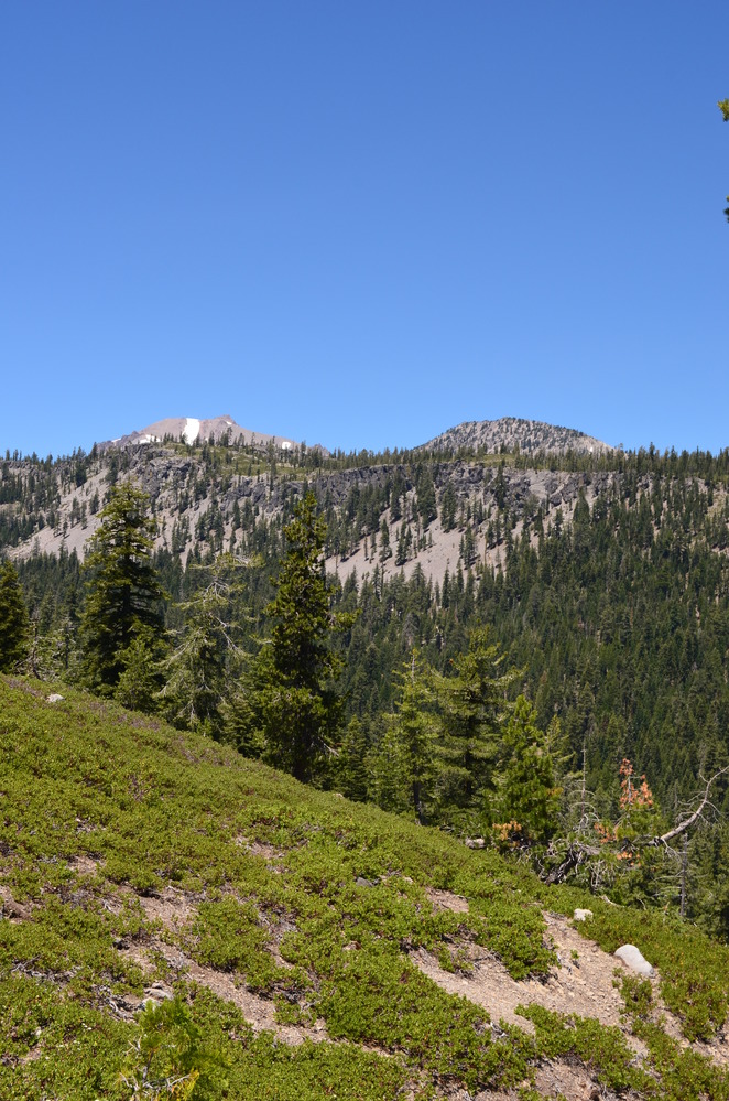 A partial view of Lassen Peak from behind mountains on the trail to Drake Lake.