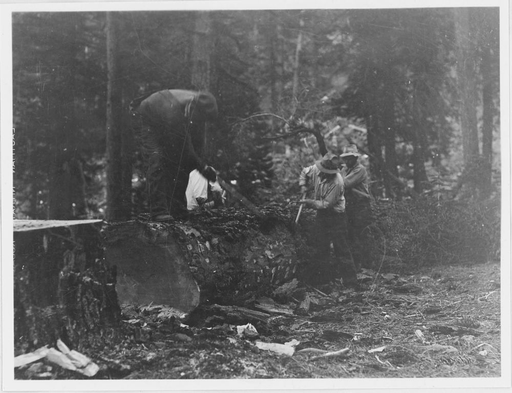 Administrative Collections: Album 2-Insect control activities showing marked and felled infested tree, close up of insect damage, and workers preparing felled infested tree for burning.