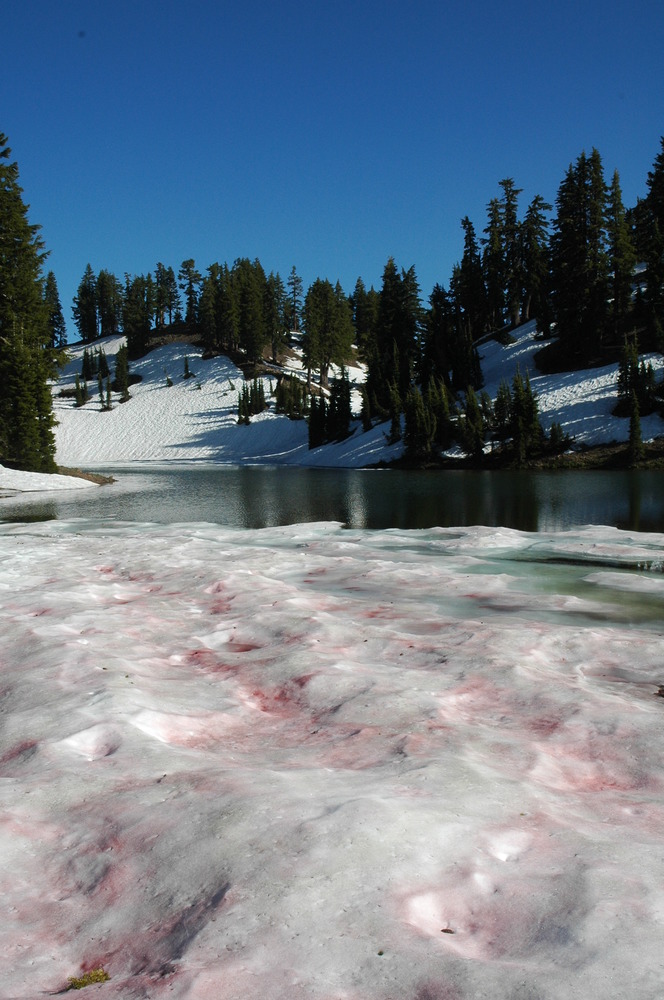 Pink snow algae on the top of patches of snow near the Ridge Lakes.