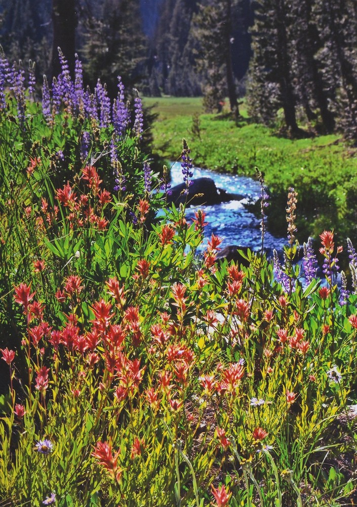 Colorful red paintbrush flowers and purple lupines growing in a grassy meadow along the banks of a rushing blue creek.