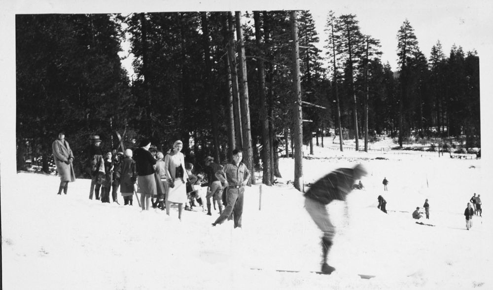 Arthur G. Holmes Collection: Album 1. Skiers at Mineral, CA ski hill. Date Unknown.