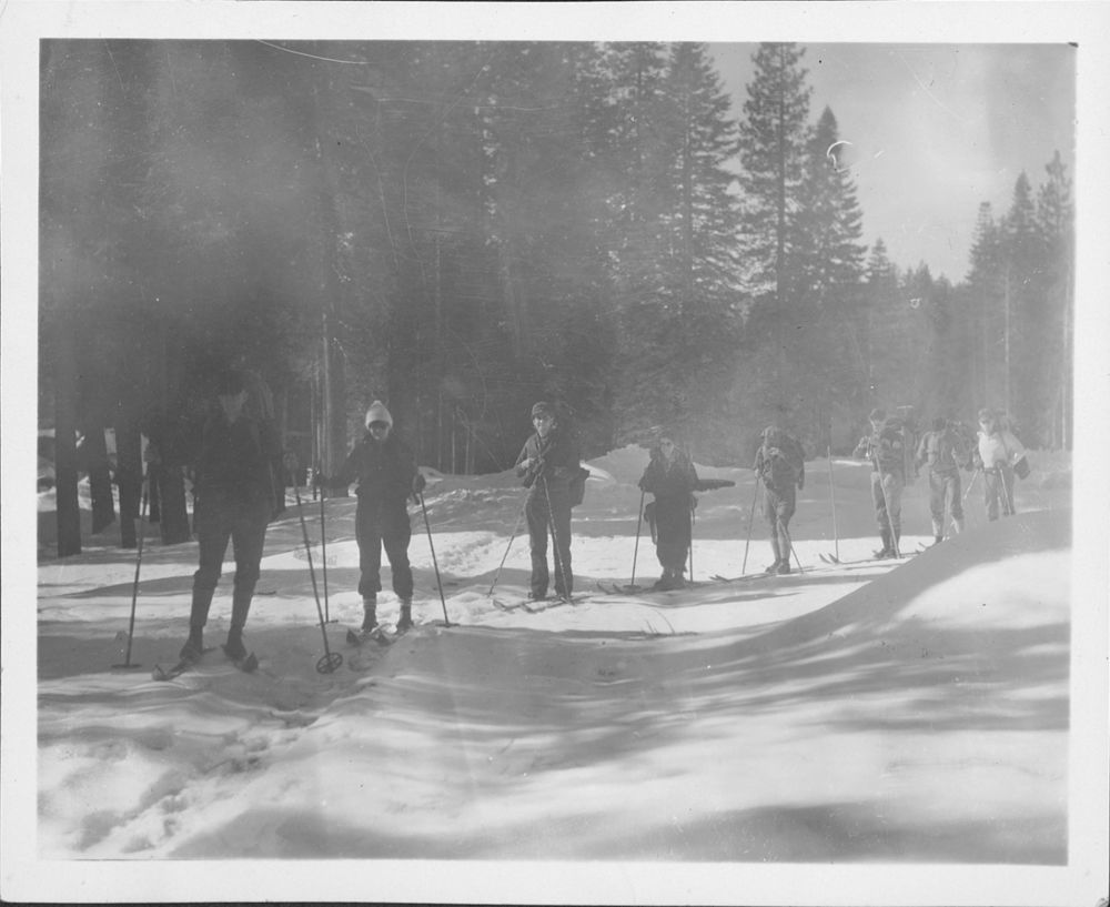 Arthur G. Holmes Collection: Album 3--Group including Mrs. Harold Paige and Mary Adams at start of ski trip to Lassen Peak . Ski trip to Lassen Peak. Page Note " Good bye, have a good trip-wish I were going with you."