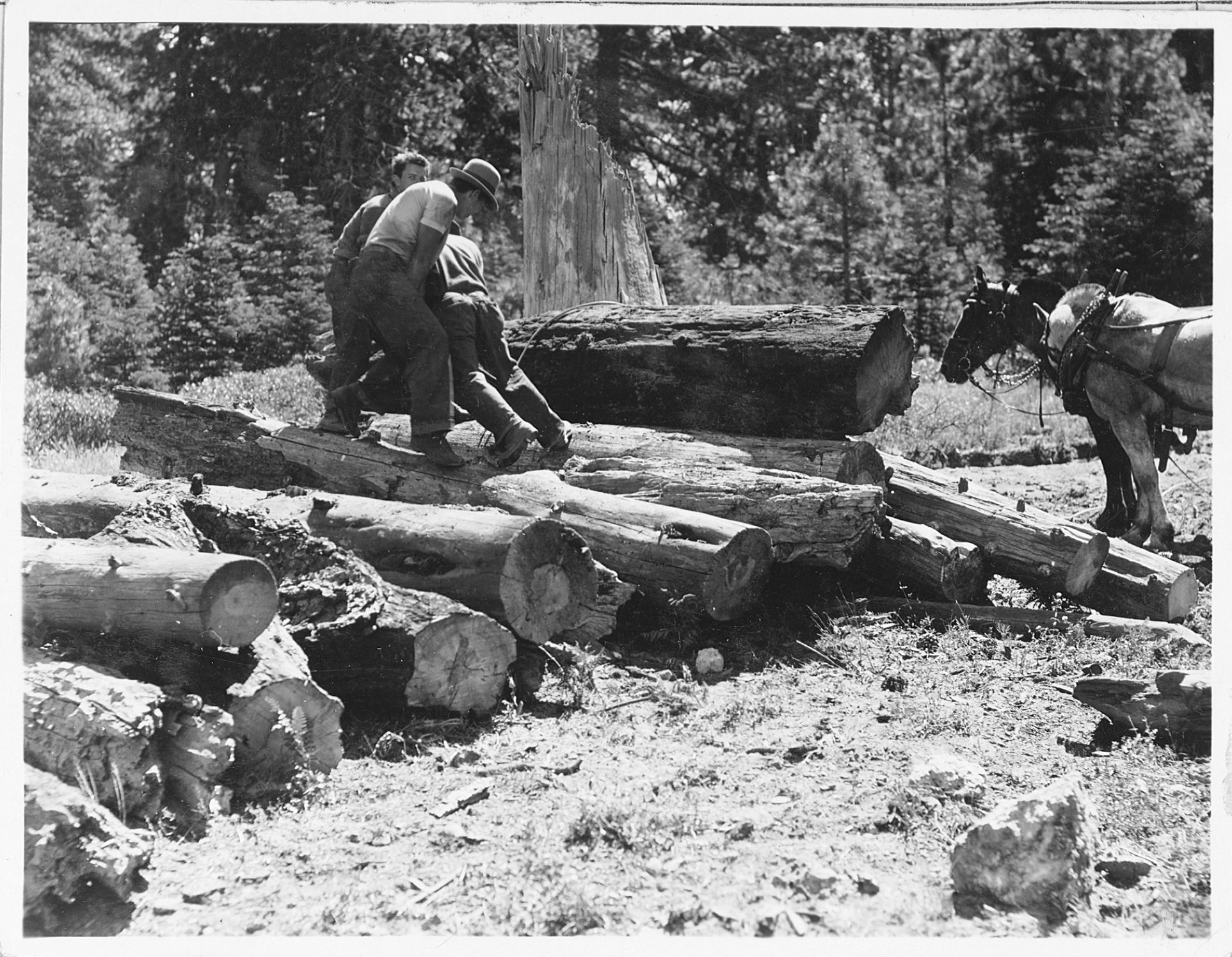 Administrative Collections: Album 5 (Emergency Conservation Works) -Before, during, and after views of roadside and forest clean up showing areas in need of clean up, workers clearing timber and debris, and brush and timber piled