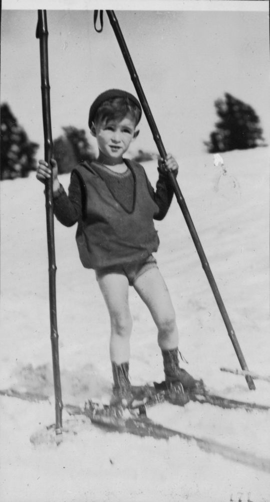 Mrs. Patton, Mrs. Beresford, and child Denny skiing at Emerald Lake