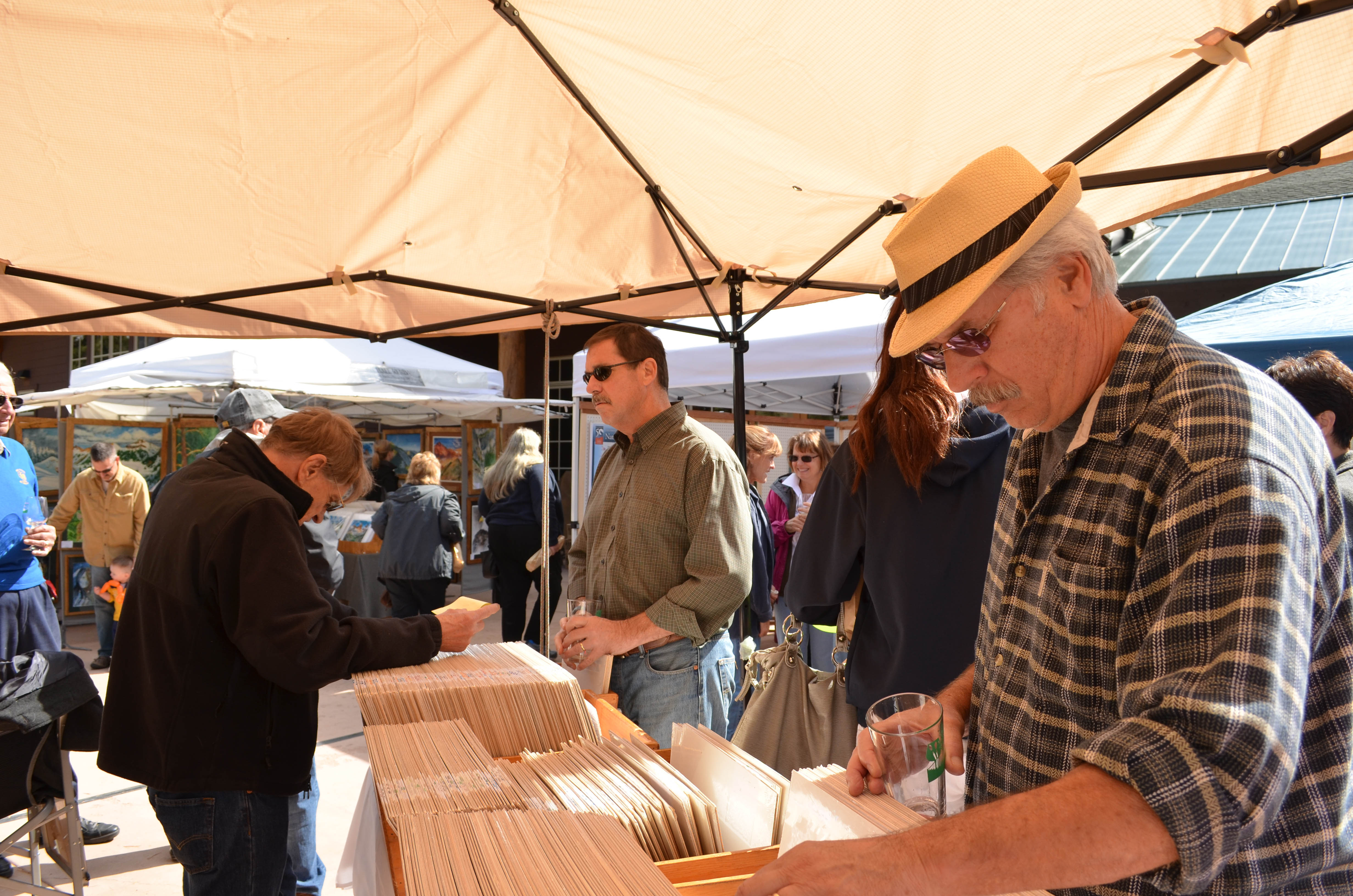 Many people browsing and socializing in and in between art booths during the Wine and Art Festival.