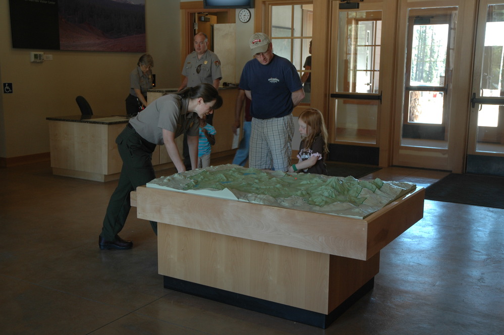 A ranger and visitors standing around looking at the 3-D relief map of the park inside the Kohm Yah-mah-nee Visitor Center.