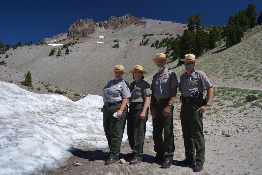 Janet Rogers, Karen Haner, Steve Gibbons, and John Fish (left to right) stand in front of Lassen Peak at the Reach the Peak Official Trail Dedication at the Lassen Peak parking area. Lassen Peak in background.