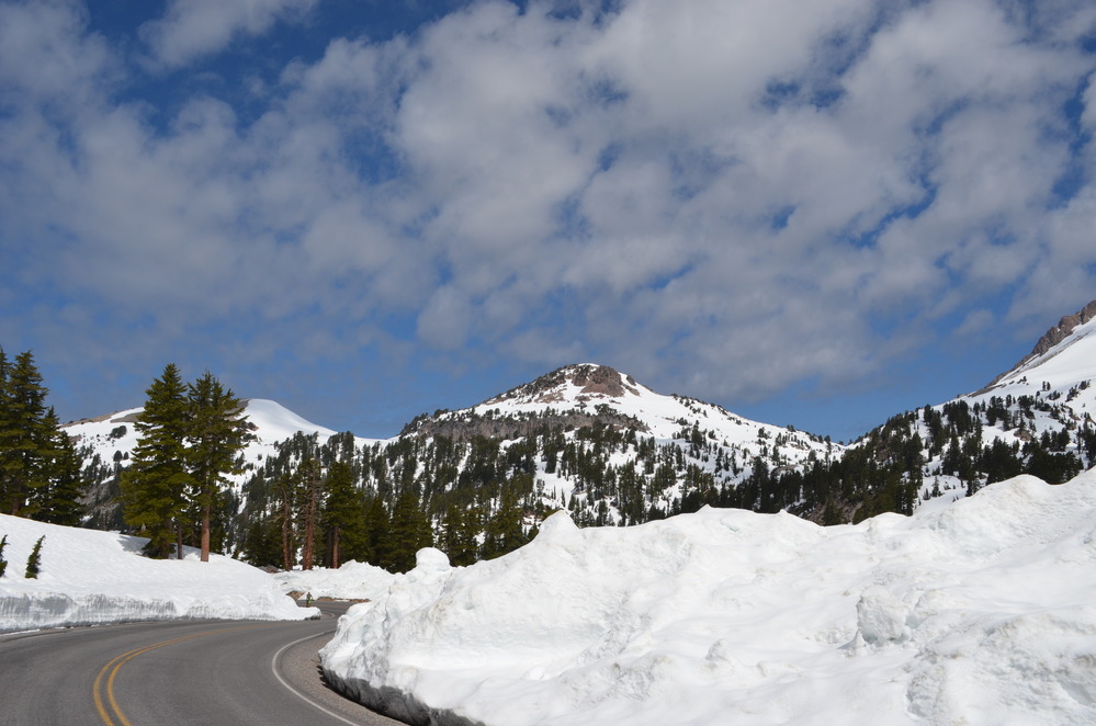 Eagle Peak and Lassen Peak rising above the Main Park Road surrounded by snowdrifts with clouds in the sky.