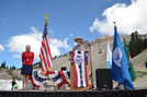 Superintendent Steve Gibbons speaks at the centennial naturalization ceremony at the Lassen Peak parking area. Lassen Peak in background.