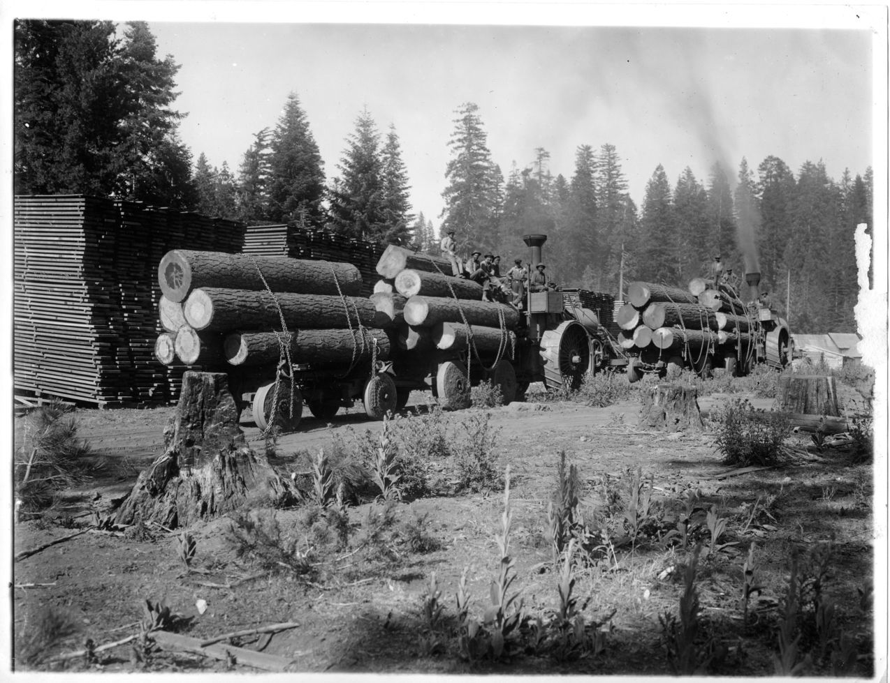 Benjamin F. Loomis Historical Photograph Collection:Best Engines in Loomis mill lumberyard pulling trailers loaded with logs. On back of print: Two Best engines hauling logs to Loomis sawmill at Viola. Loomis