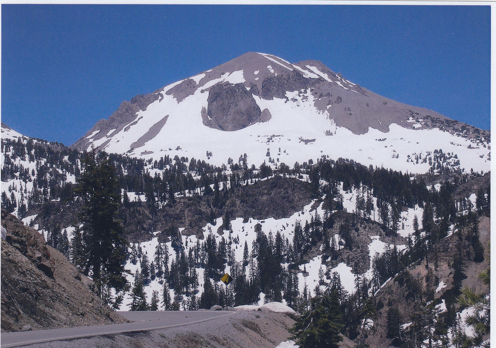 View of snow-covered Lassen Peak from the Main Park Road with a rockslide warning sign next to the road.