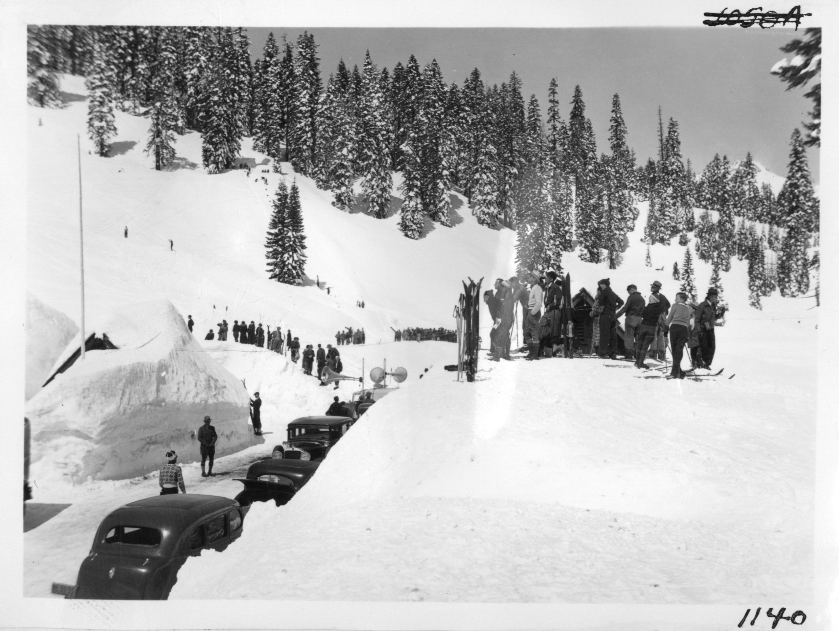 Administrative Collections: Album 9 (Miscellaneous) -Skiers gathered near car-lined road, possibly for ski-tournament