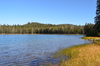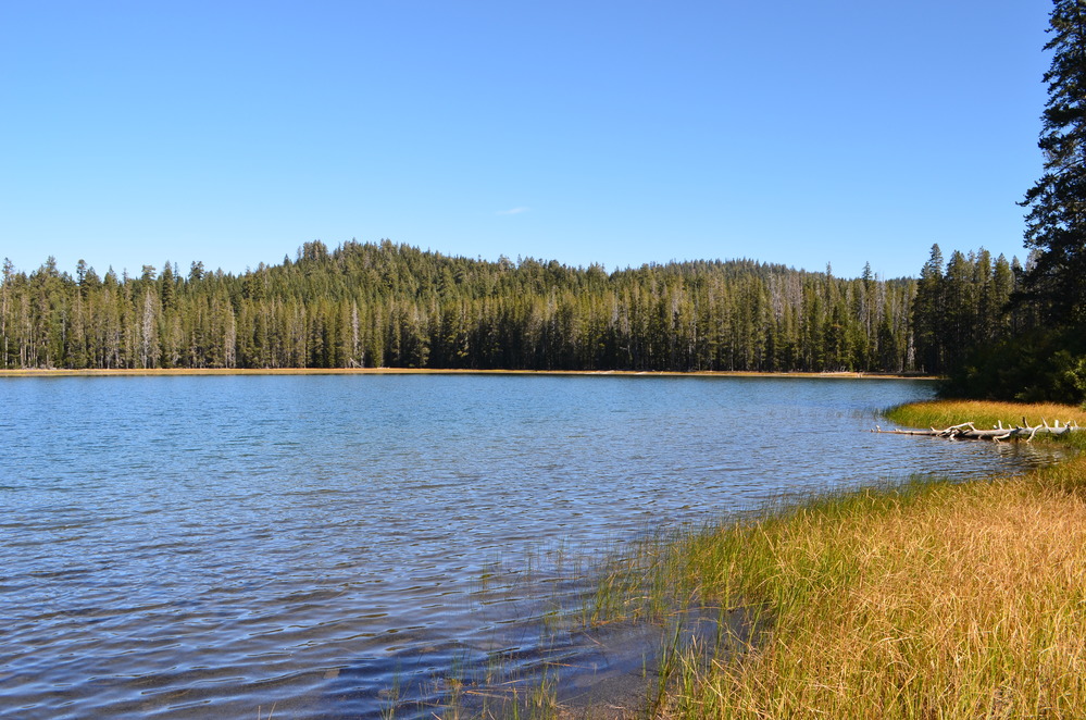 The rippling blue waters of Widow Lake surrounded by forest and grassy shores.