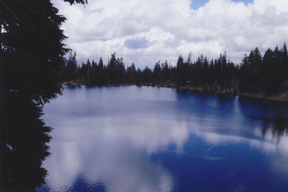 View of the reflective, deep blue waters of Shadow Lake surrounded by forest on a cloudy day.
