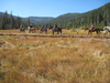 Horseback riders on a boardwalk in a meadow in Warner Valley.