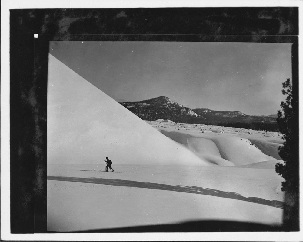 Arthur G. Holmes Collection: Album 3--Views of Eugene Barton skiing at Cinder Cone. Page Note " Barton rounding the West side of the Cinder Cone. The lava flow-now white clad but jet black in summer. The night of the 16th at Butte Lake."