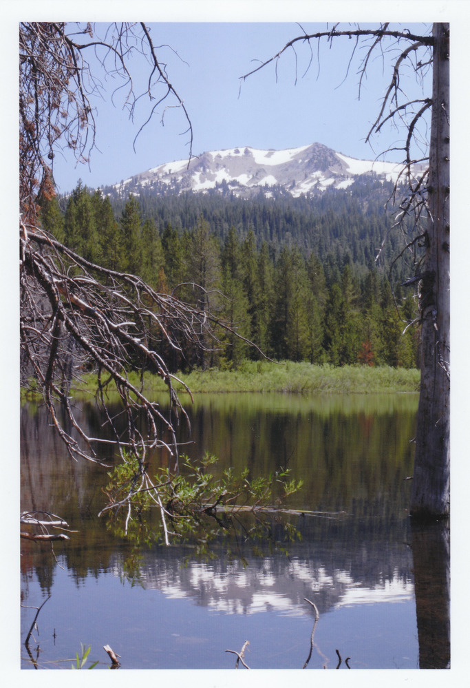 View of partly snow-covered Reading Peak reflected in the calm waters of Hat Lake between the trees.