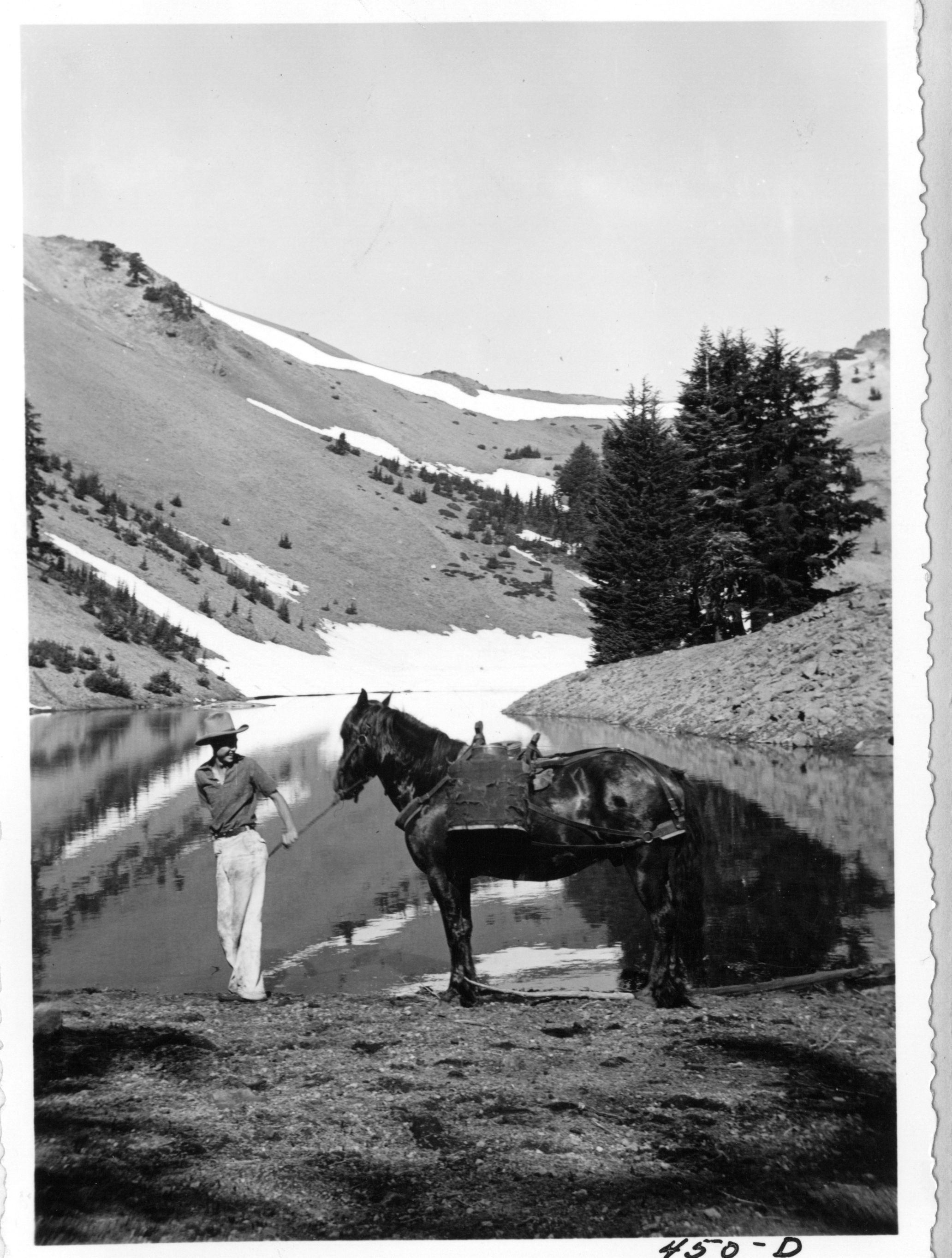 Administrative Collections: Album 9 (Miscellaneous) -Man and horse at edge of Ridge Lakes after planting fish