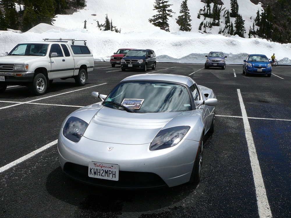 A car parked in a parking lot with snow and trees on the hillsides in the background.