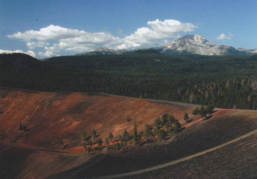 A view of Lassen Peak from the trail on the rim of the crater on top of the Cinder Cone.