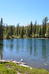 The rippling blue waters of Sifford Lake with Lassen Peak visible behind the trees.