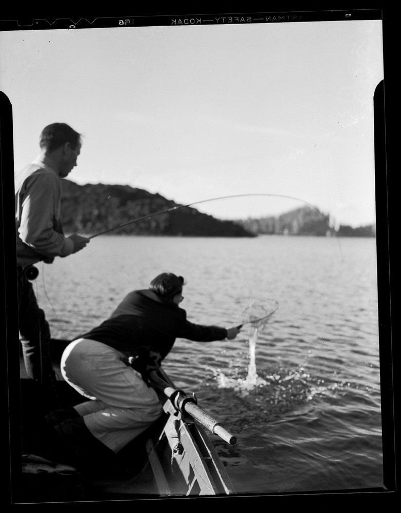 A woman leans over the side of the boat to net a fish, man standing holds fishing line behind her