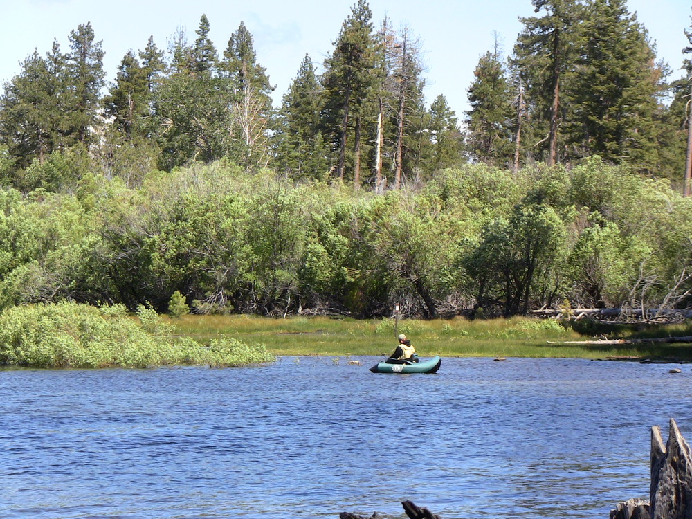 A boater fishing from an inflatable chair near grass and vegetation in Manzanita Lake.