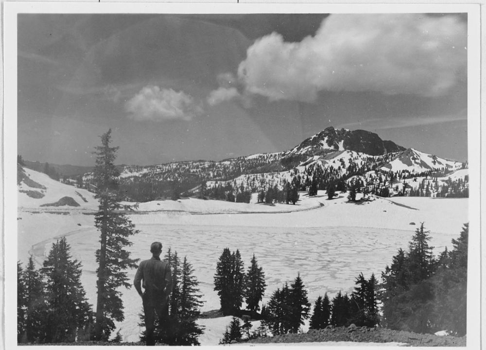 Administrative Collections: Album 2-Lake Helen covered in snow and ice with Brokeoff Mountain in background.