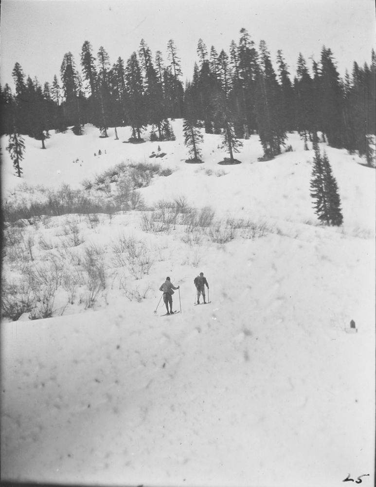 Arthur G. Holmes Collection: Album 1. Trip up Lassen Peak and across the Park in March, 1931 by Oliver Kehrlein, James Masser, James B. Linford, Robert Strong, and Art Holmes. Two of group on way back to Mineral.