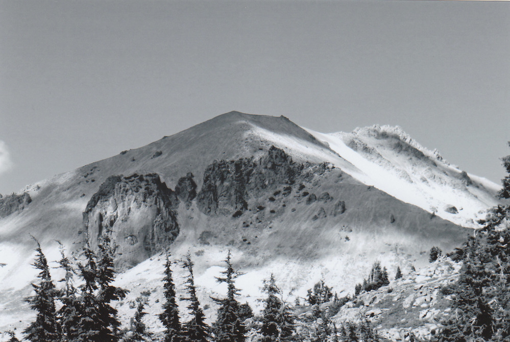 A black and white image of Lassen Peak rising into the sky above the trees with shadows on its slopes made by clouds.