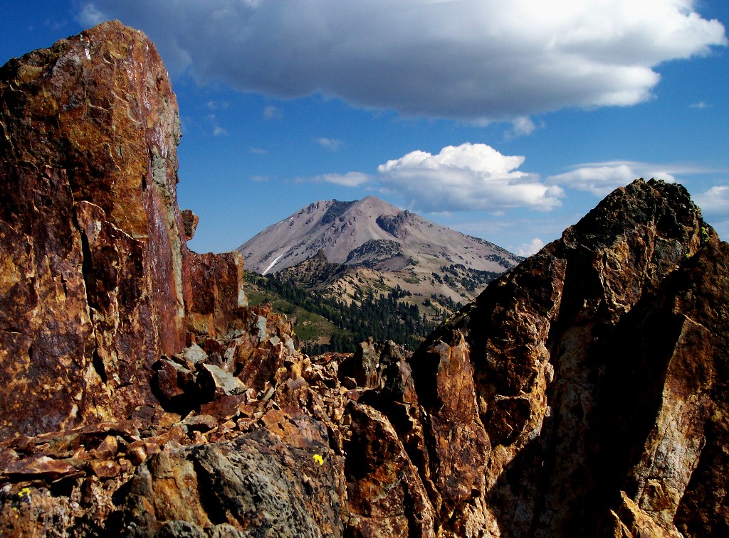 Lassen Peak viewed through colorful rock formations with clouds up in the sky.