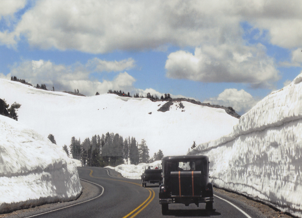 Two black Model A cars driving on the Main Park Highway near Lake Helen with tall snowdrifts on the sides of the road.