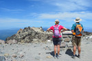 Two hikers reading a wayside on the Lassen Peak Trail.
