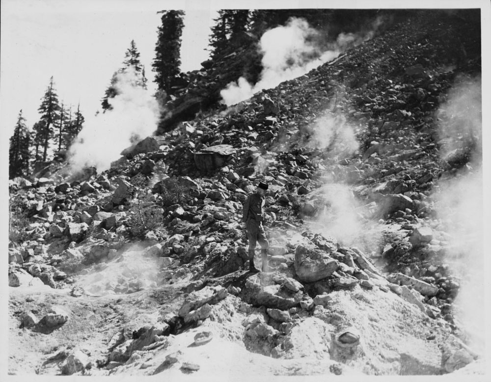 Administrative Collections: Album 3 (Scenics) -Man standing amid fumaroles at Devil_s Kitchen.